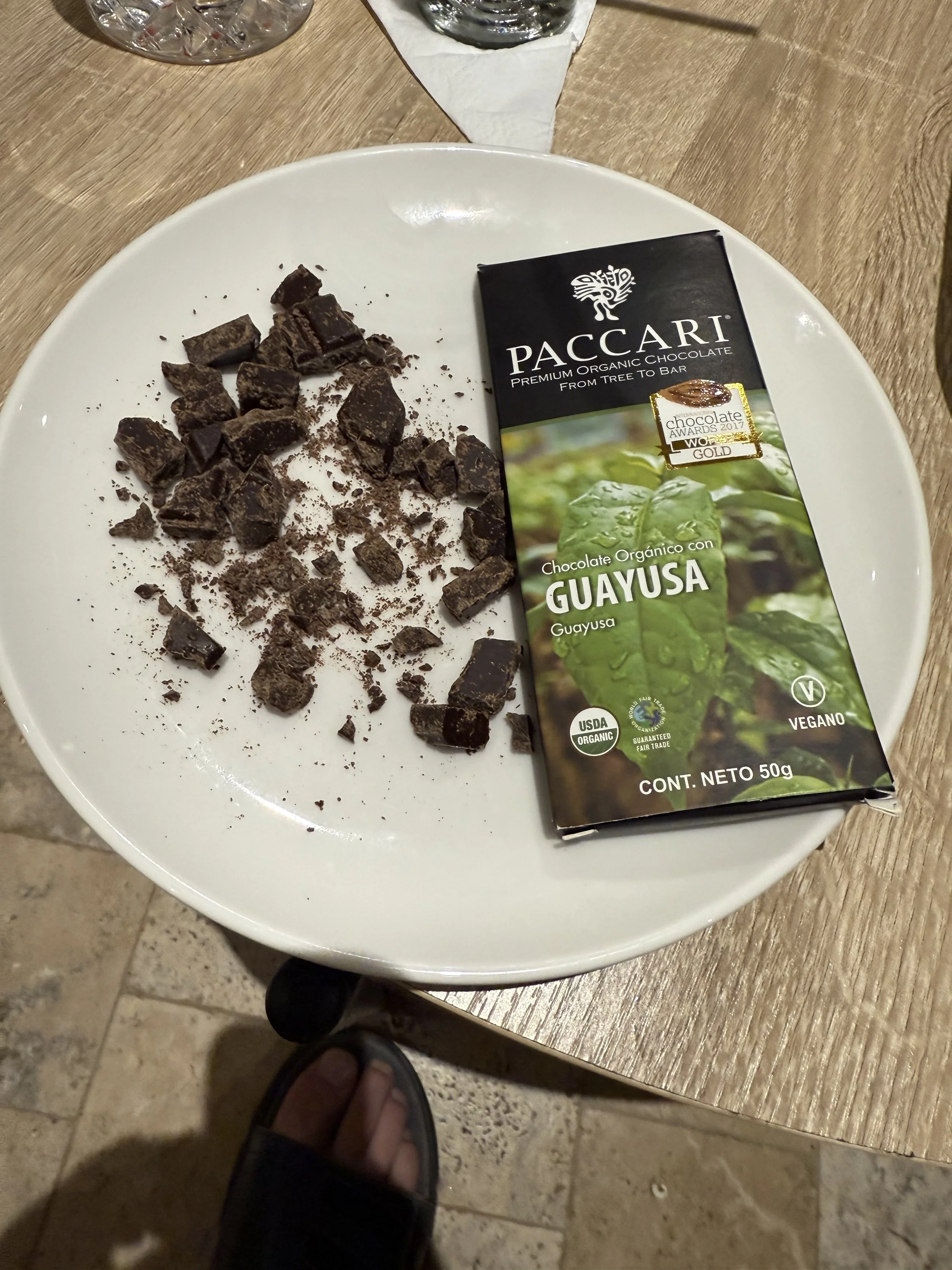 Before dinner, we met with our tour guide to go over the next days activities. Robby also set up a quick chocolate tasting for us. He had three chocolate bars. One made from cocoa from the interior of Ecuador, one from the coastal area, and one from the amazon jungle. They were all very good. I may need to buy some to take home.