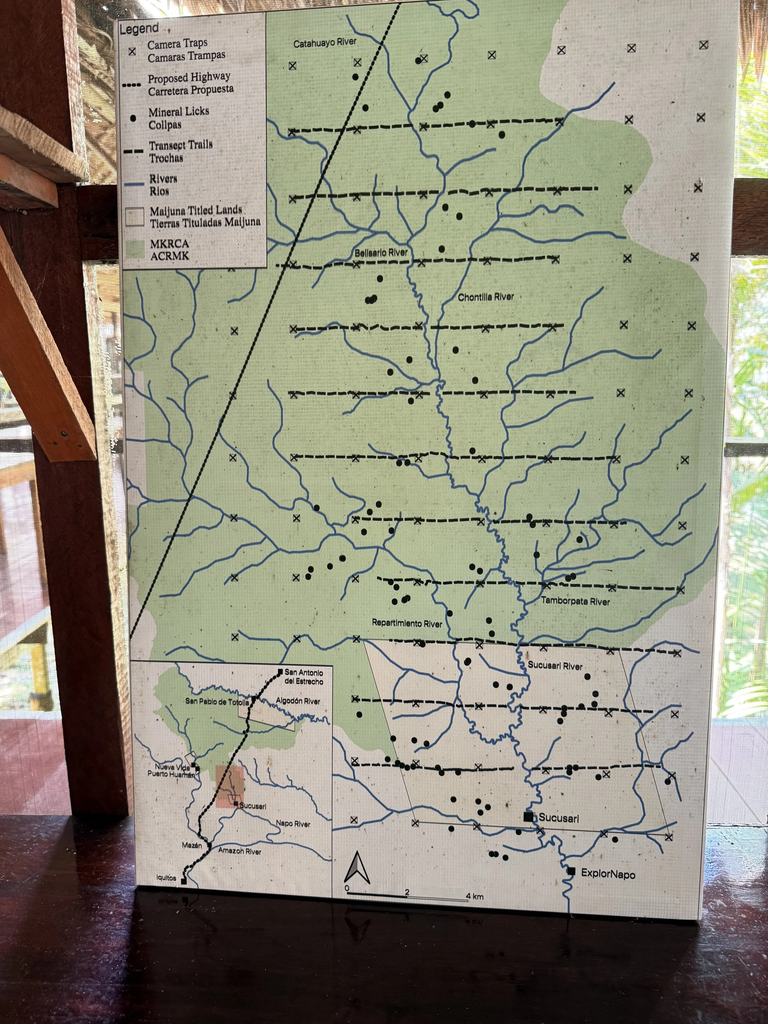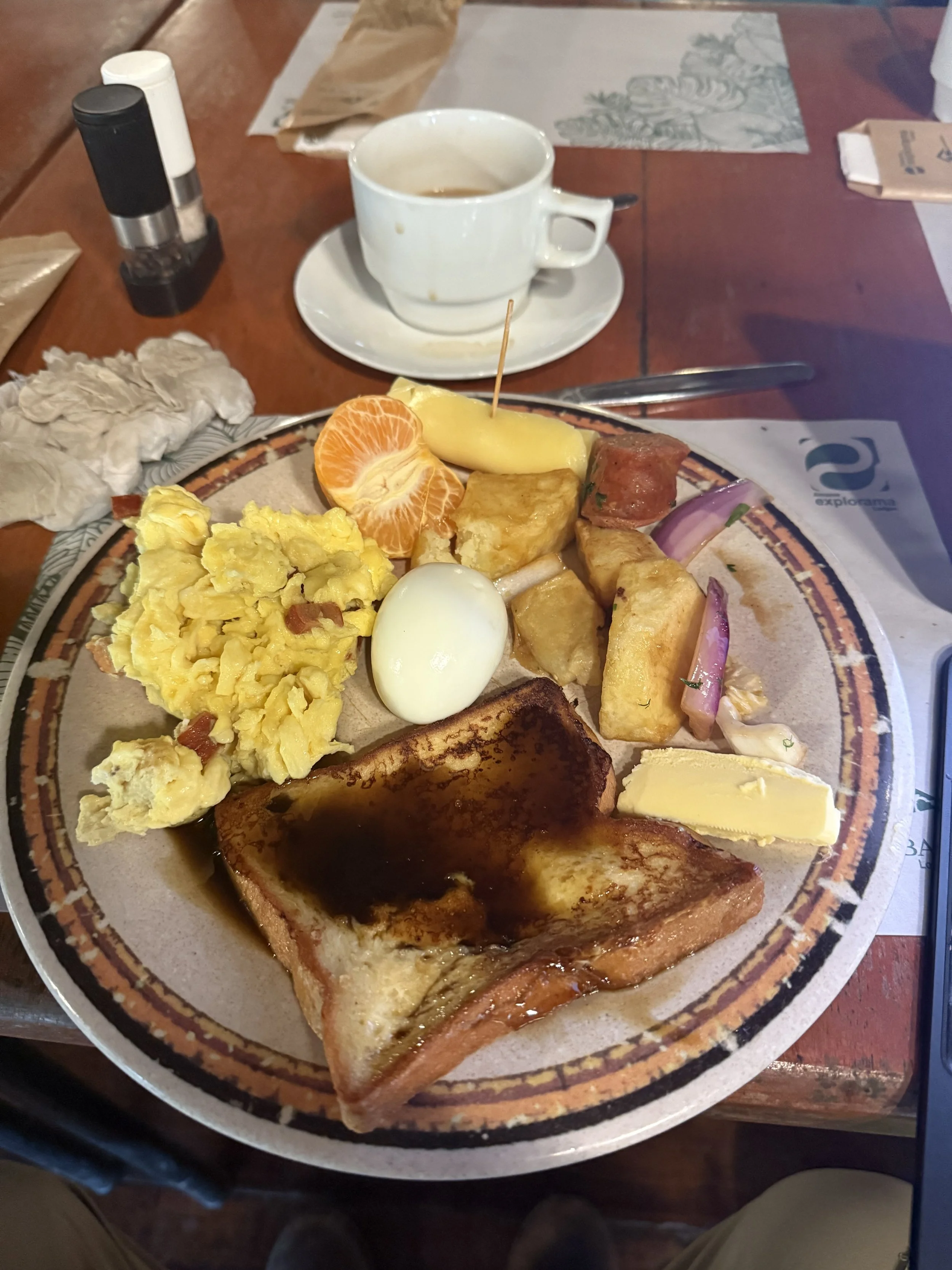 Since we got up so early, they provided breakfast at the ExplorNapo Lodge. This lodge is an educational center used to help educate students and teachers on the biodiversity of the area. The facility is pretty big, with lodging, and meeting rooms. Student plaques are displayed all over the ceiling. Many from the states. There was a Capybara on the property as well. Not sure if it was wild or domesticated. It did not seem to mind us being around.