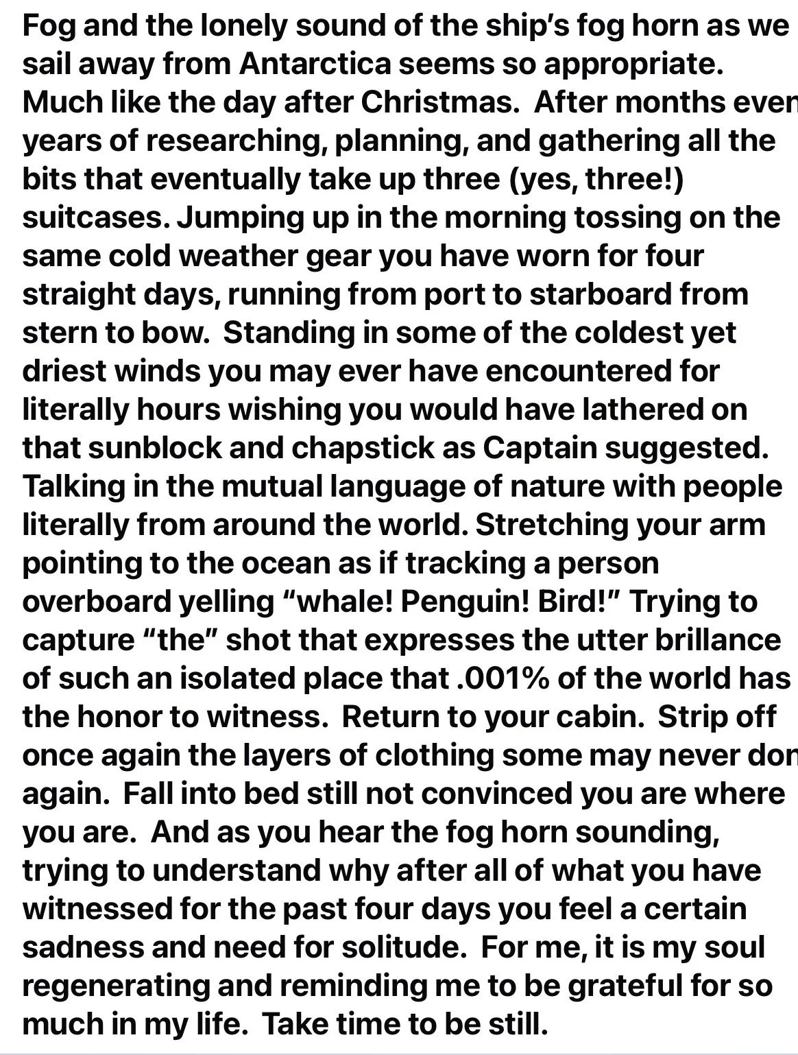 We left Elephant Island around 1:00 and started heading towards Port Stanley in the Falkland Islands. The weather has become foggy, so it will be along journey. We will be arriving there in two days.