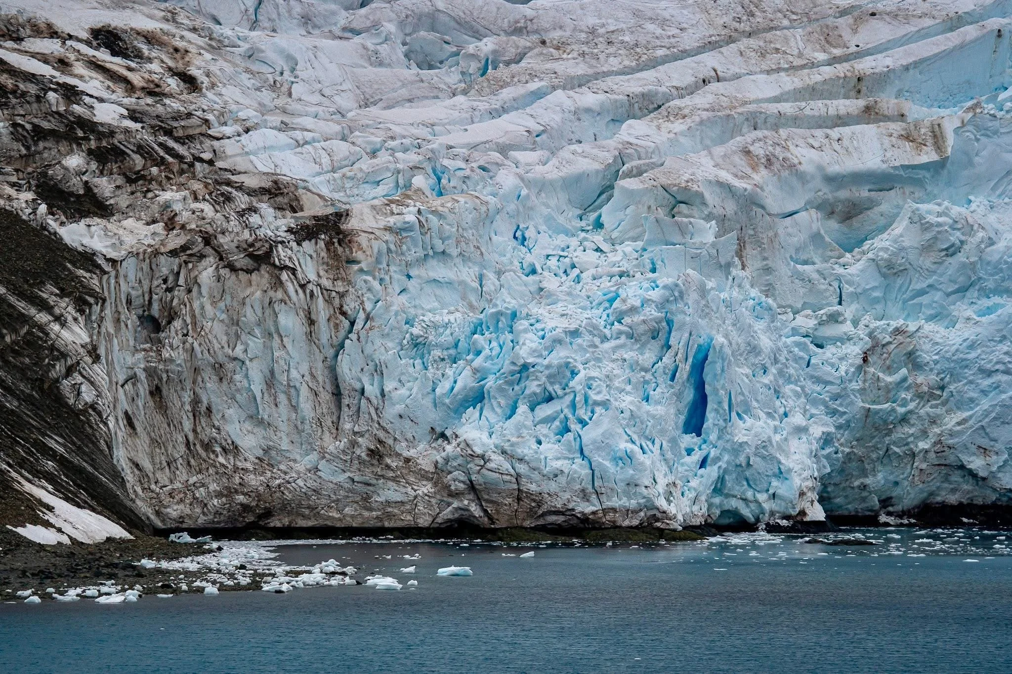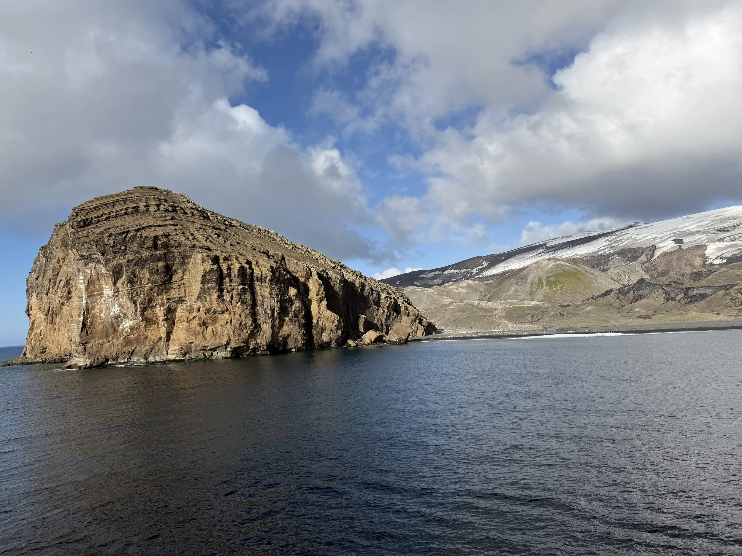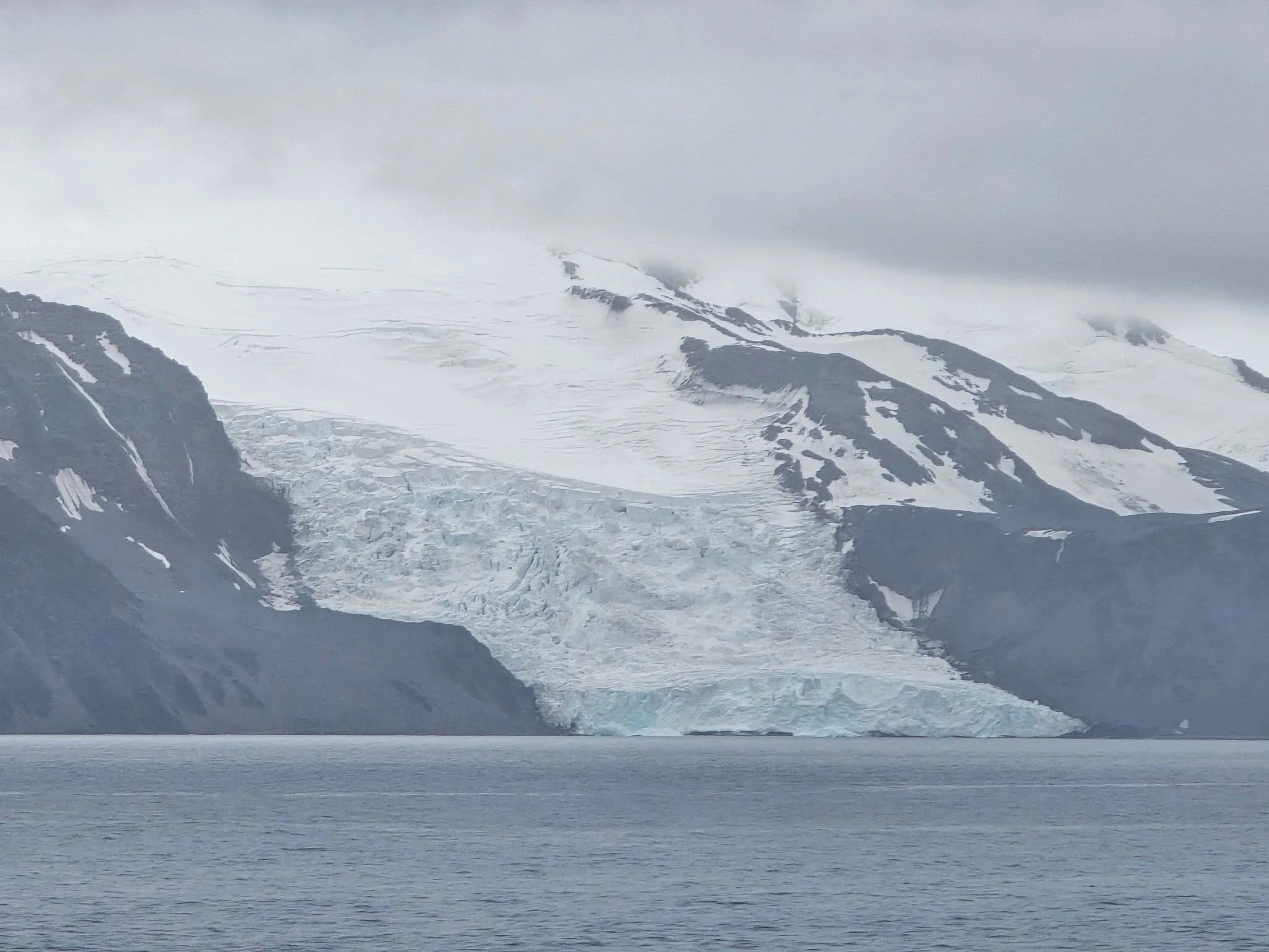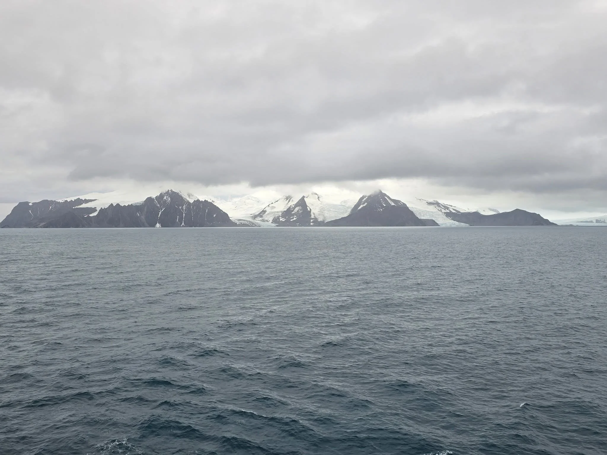 The seas are calm, but the skys are cloudy. We are not able to see the tops of the mountains on the island. But there are many glaciers coming into the sea.
