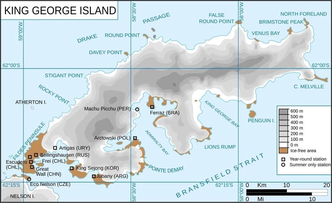 There are five research stations located here. USA, Poland, Peru, Ecuador, and Brazil.