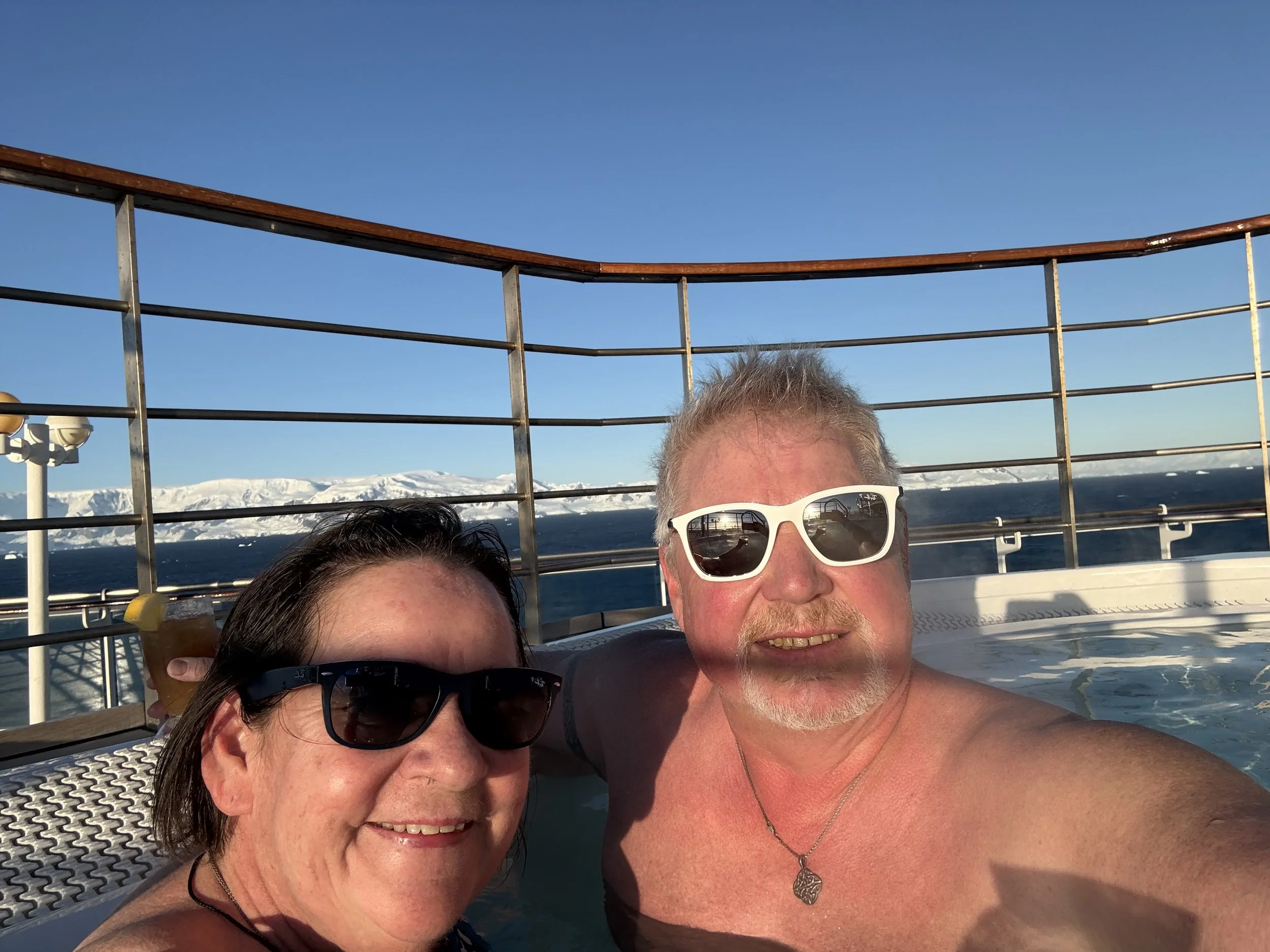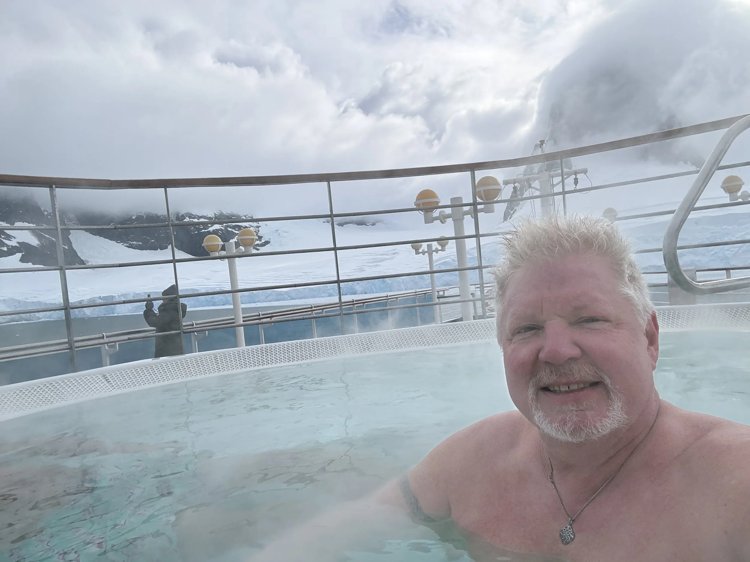 Today I got up early and went to the gym on the ship. All the treadmills and bikes face out over the front the ship. It was nice having a great view while I exercised. I had to stop now and again to watch whales pass by. Then I went to the back of the ship to resume whale watching from the hot tub!