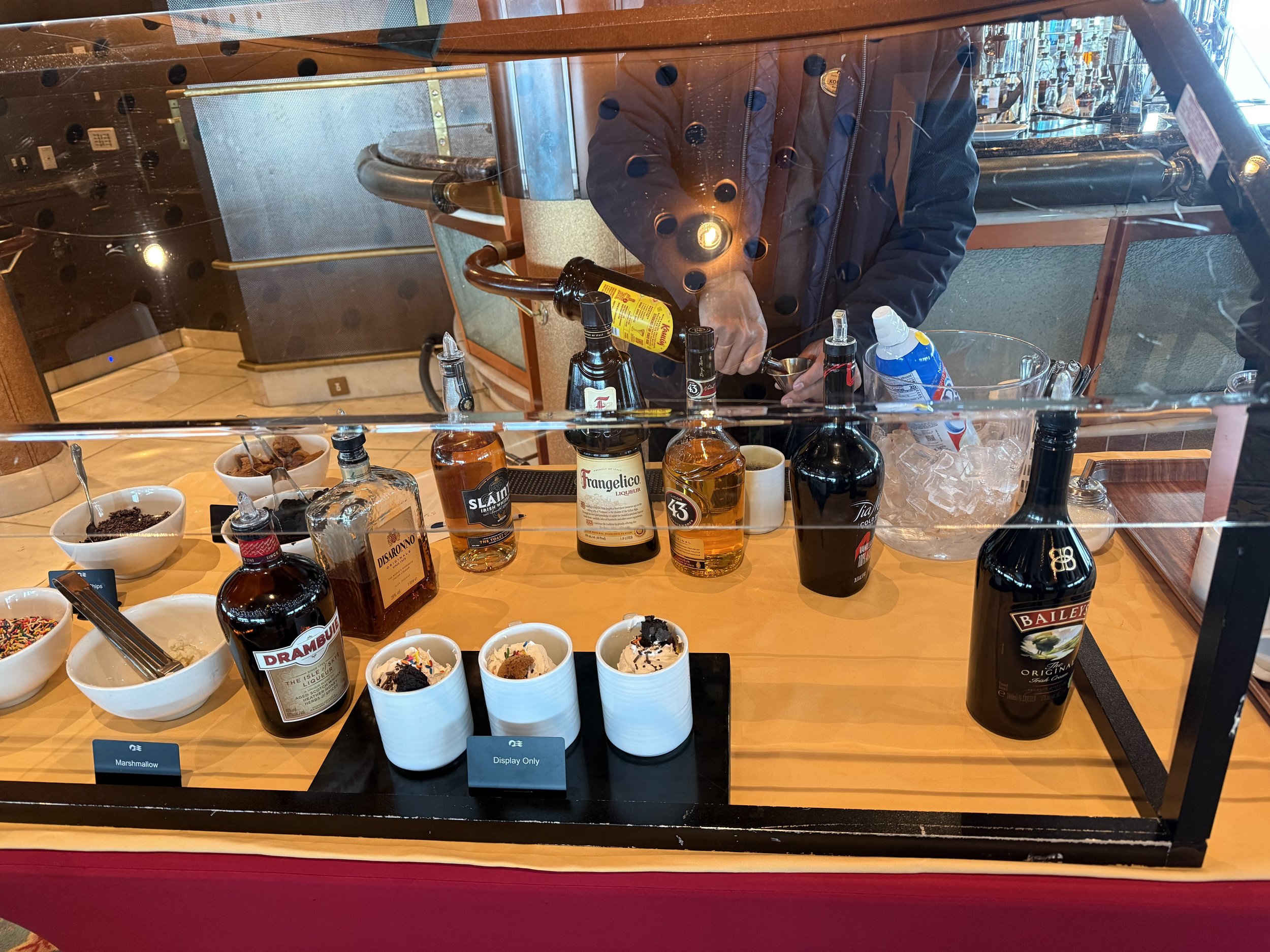 The ship has hot chocolate stations located all over the ship. In addition to hot chocolate, they offer Baileys, Kaluah and other options to add to your hot chocolate.