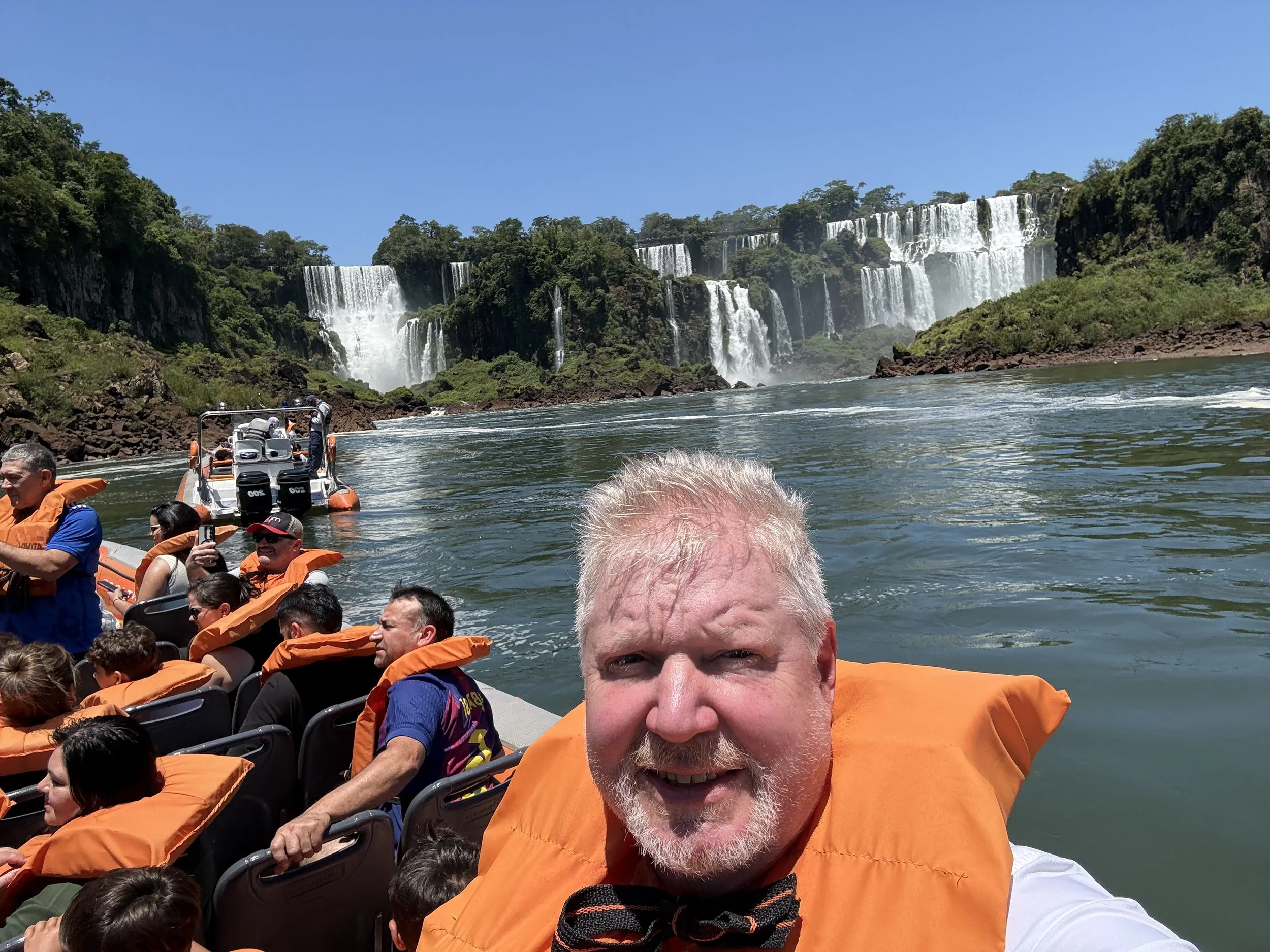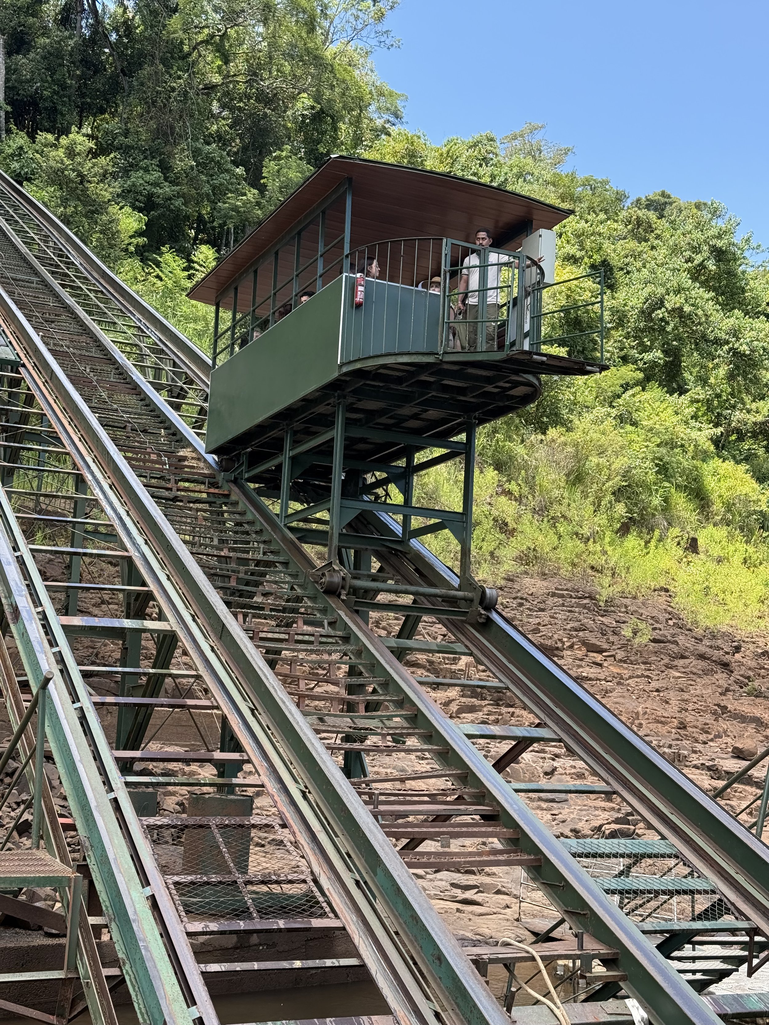 After the hike, we took a boat ride with Macuco Safari Tours on the Iguazu river to get a closer look at the falls. This involved a bit of transportation variety. First we rode an open electric vehicle through the rainforest. There was a guide that pointed out various flora and fauna in the forest. Then we had to catch a jeep for the next segment. The road is too steep for the electric vehicles, so we had to switch. Then we rode a funicular rail car to complete the last steep segment of the trail to the river.