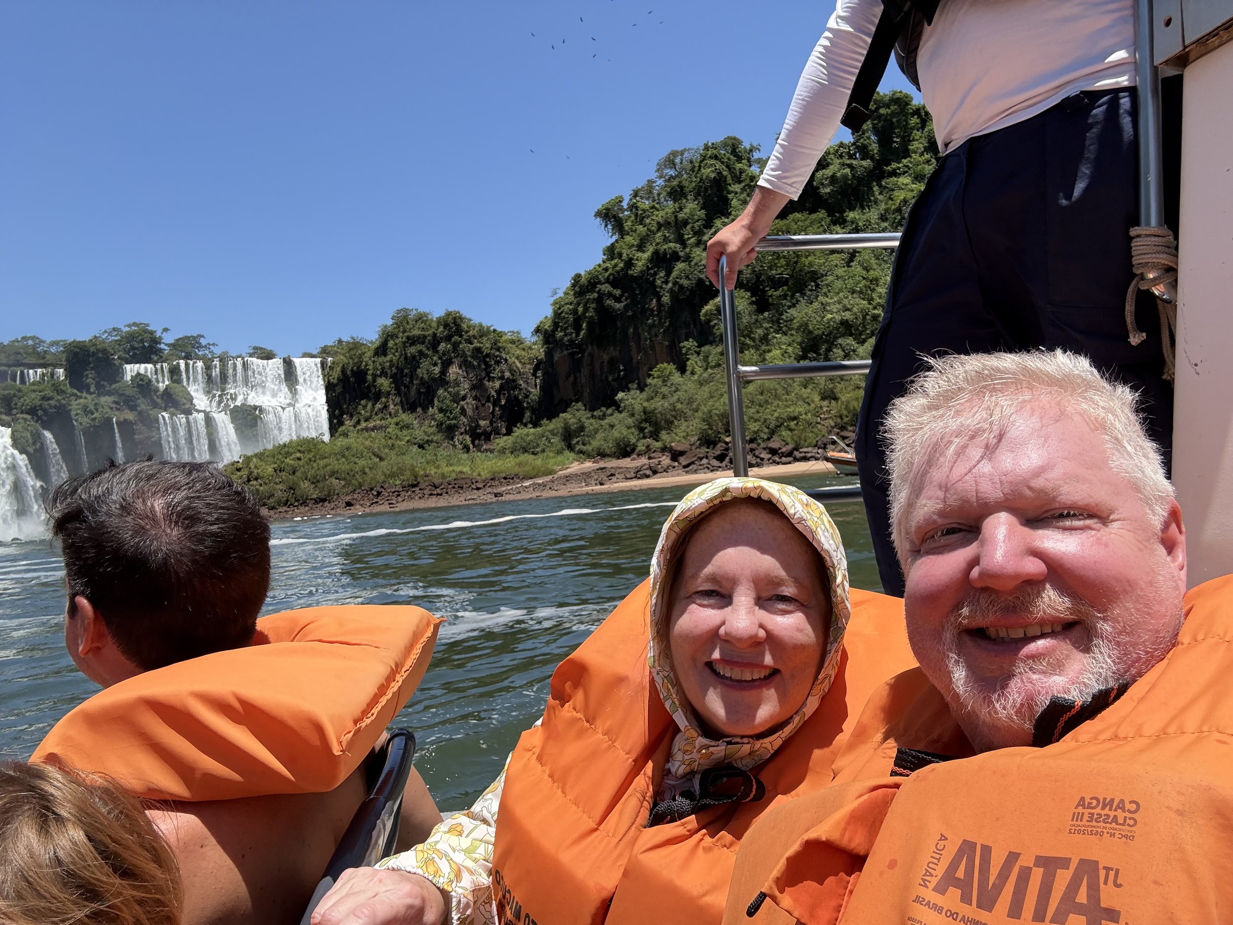 We were warned that the boat ride would be fast and wet. They recommended that you did not wear glasses ar carry anything on board. We left our shoes and bags with our guide and boarded the boat. It was a zodiac style boat with about 20 seats. The driver of the boat took us up river through the rapids and to the falls. There was a lot of sharp turns with big sprays of water. If that did not get you wet, he took us UNDER the falls. We got totally soaked. It was great fun!
