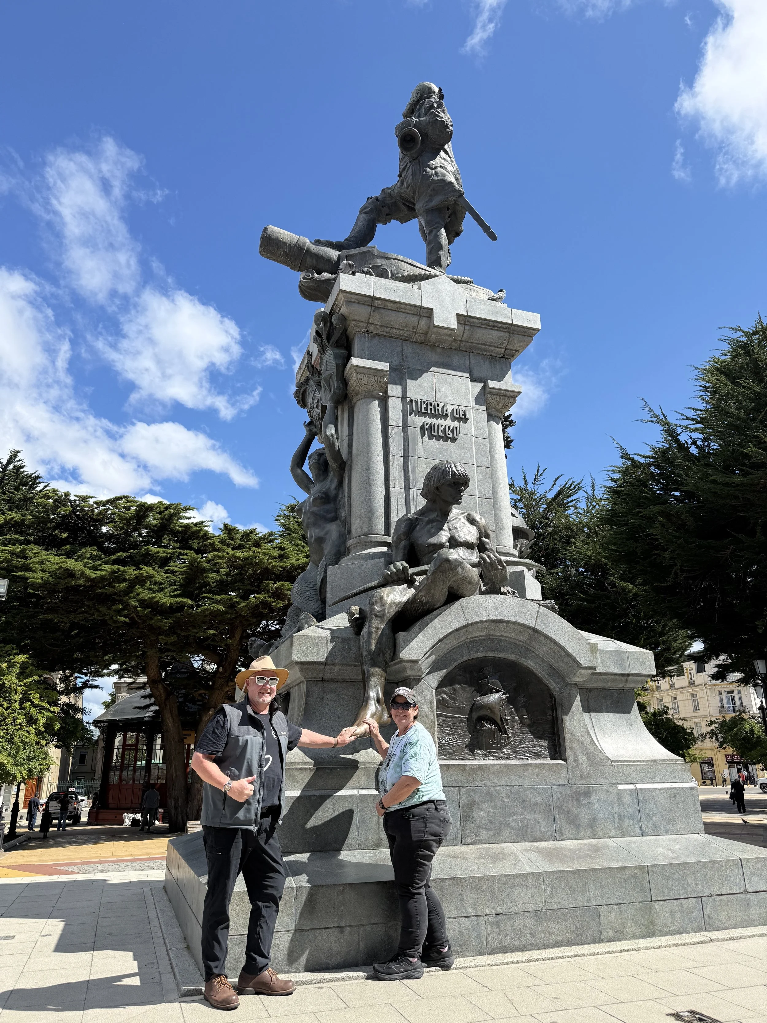 In the middle of the Plaza, there is a bronze statue of Magellan. Below him are two indigenous figures representing the native people of Patagonia. There is a tradition of touching or kissing the foot of the lower indigenous figure, will bring you good luck and ensures a return to Punta Arenas.