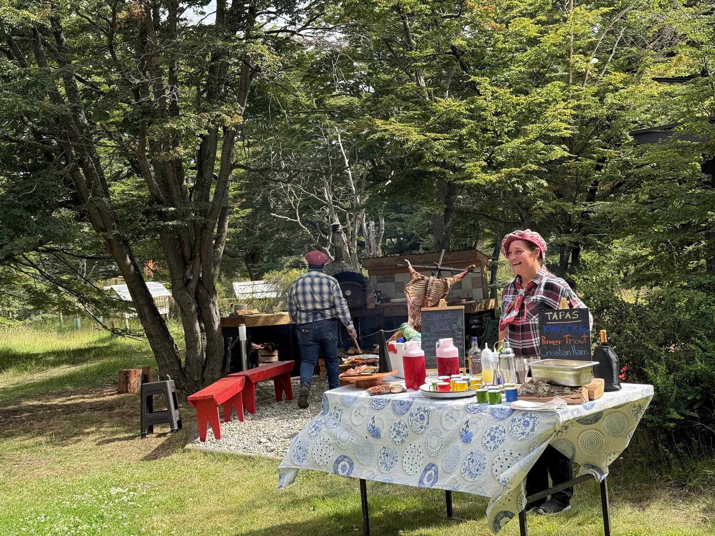 All the food was slowly cooking over an open fire. They had started cooking it 6 hours earlier. The lamb is cooked by a traditional Patagonia technique called Asado a la Cruz. The whole lamb is butterflied and fixed to a metal cross and slow roasted beside an open wood fire. It cooks next to the wood fire, not directly over it. This allows the heat and smoke to penetrate the meat. They will periodically bast it with salmuera (a simple bine of water, salt and herbs).