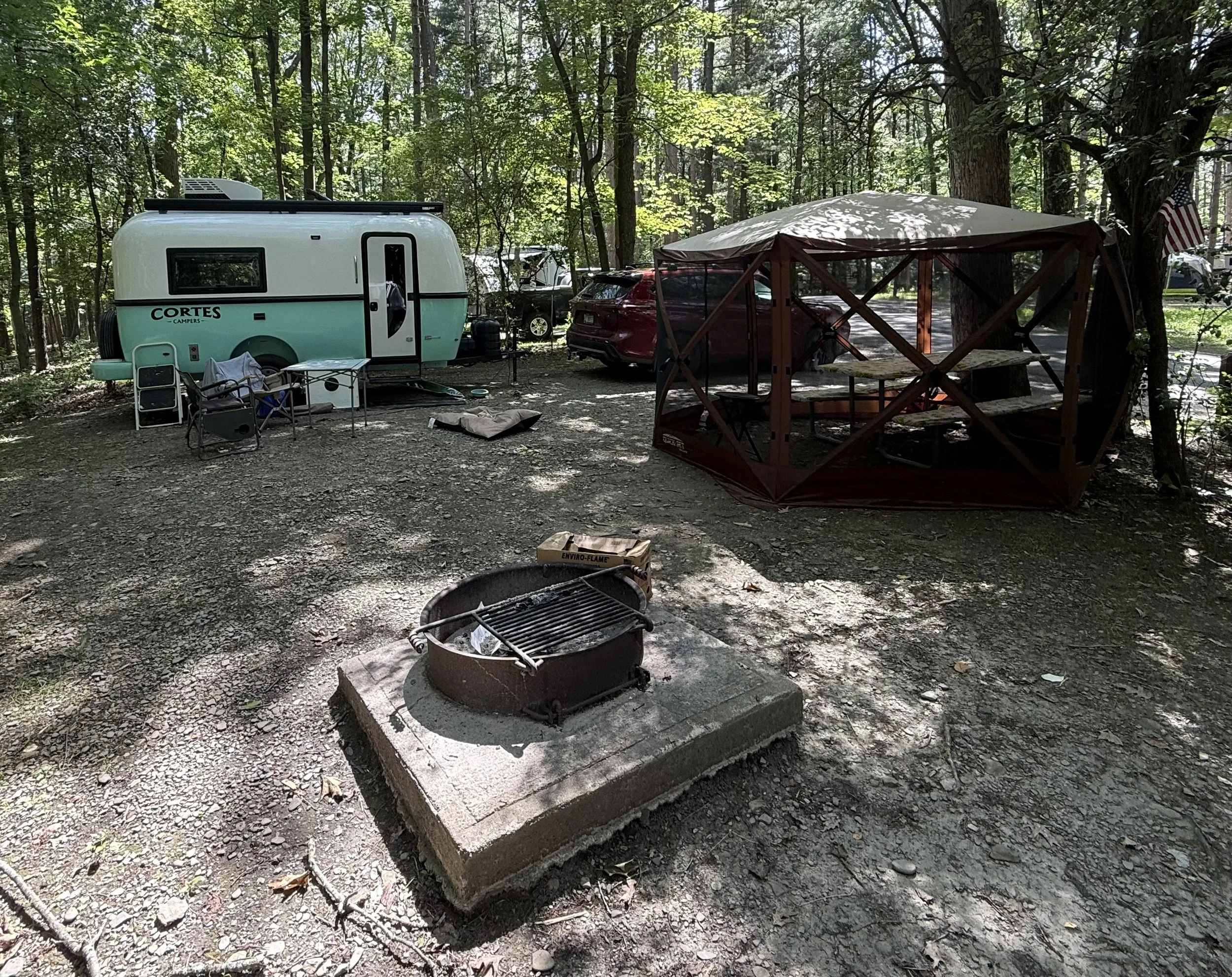 We have electrical hookup at this campsite, so were were able to use the AC unit in the camper. I turned it on a half hour before we went to bed to cool it down. I also took a shower to help cool down before bed. The showers here were nice and clean and had decent pressure and warm water (not hot).The AC unit in the camper is a bit loud and blows right on the bed. But it was cool and I was able to snuggle under a blanket. Eventually I got used to the nose and fell asleep.
