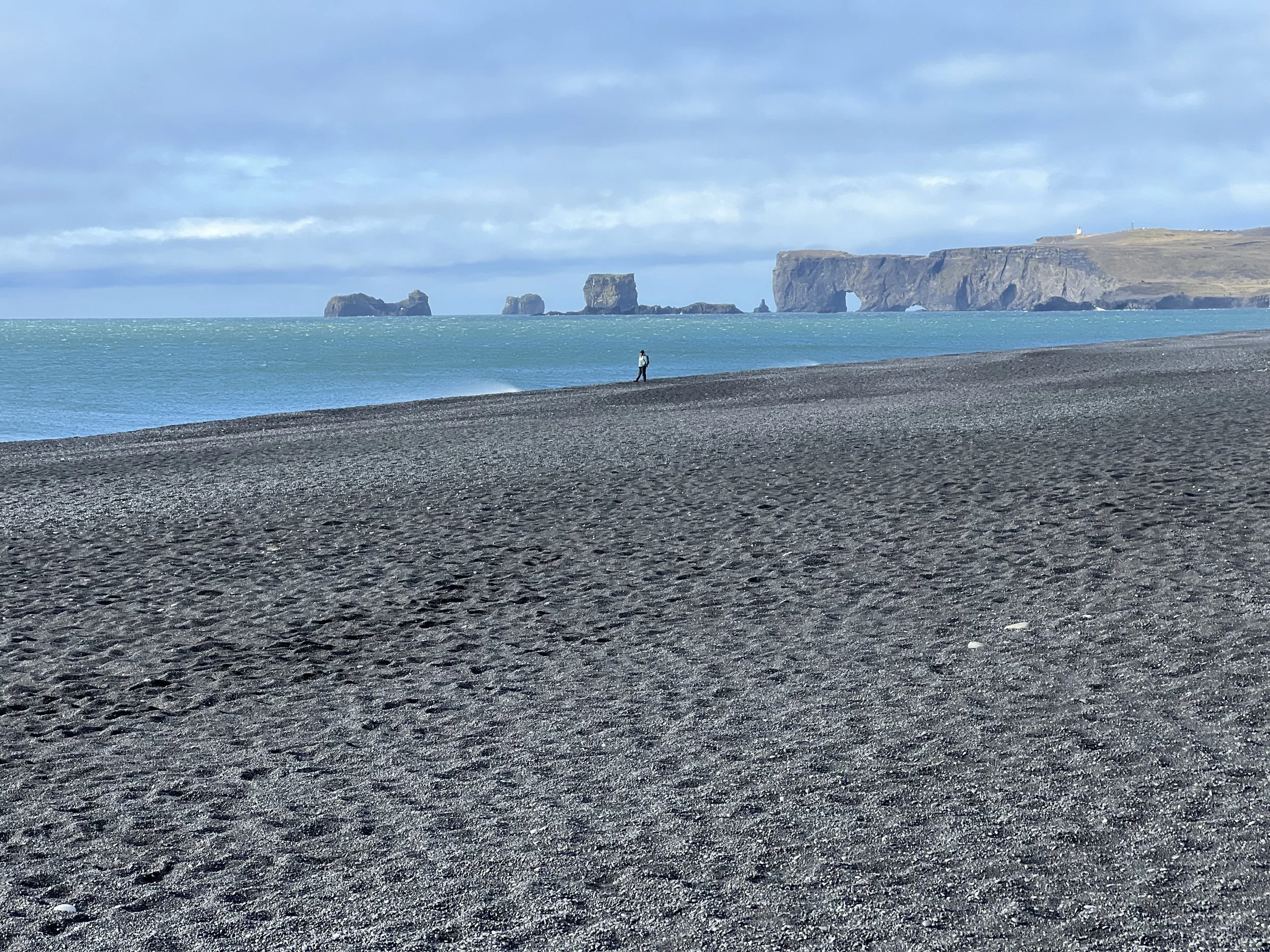 We arrived at Vik and the weather cleared, so we decided to take advantage of the weather break and drove past Vik and straight to Black Sand Beach. It was very windy, but it was coming from the land, not the sea. This kept the sand from blasting the cars in the parking lot. Apparently this is a thing and you need extra insurance coverage for this very reason. We did not have this coverage. But we were good because of the direction of the wind. The beach is worth the visit. There is a basalt cave on the beach and rock towers just off the water. We got a lot of great photos.