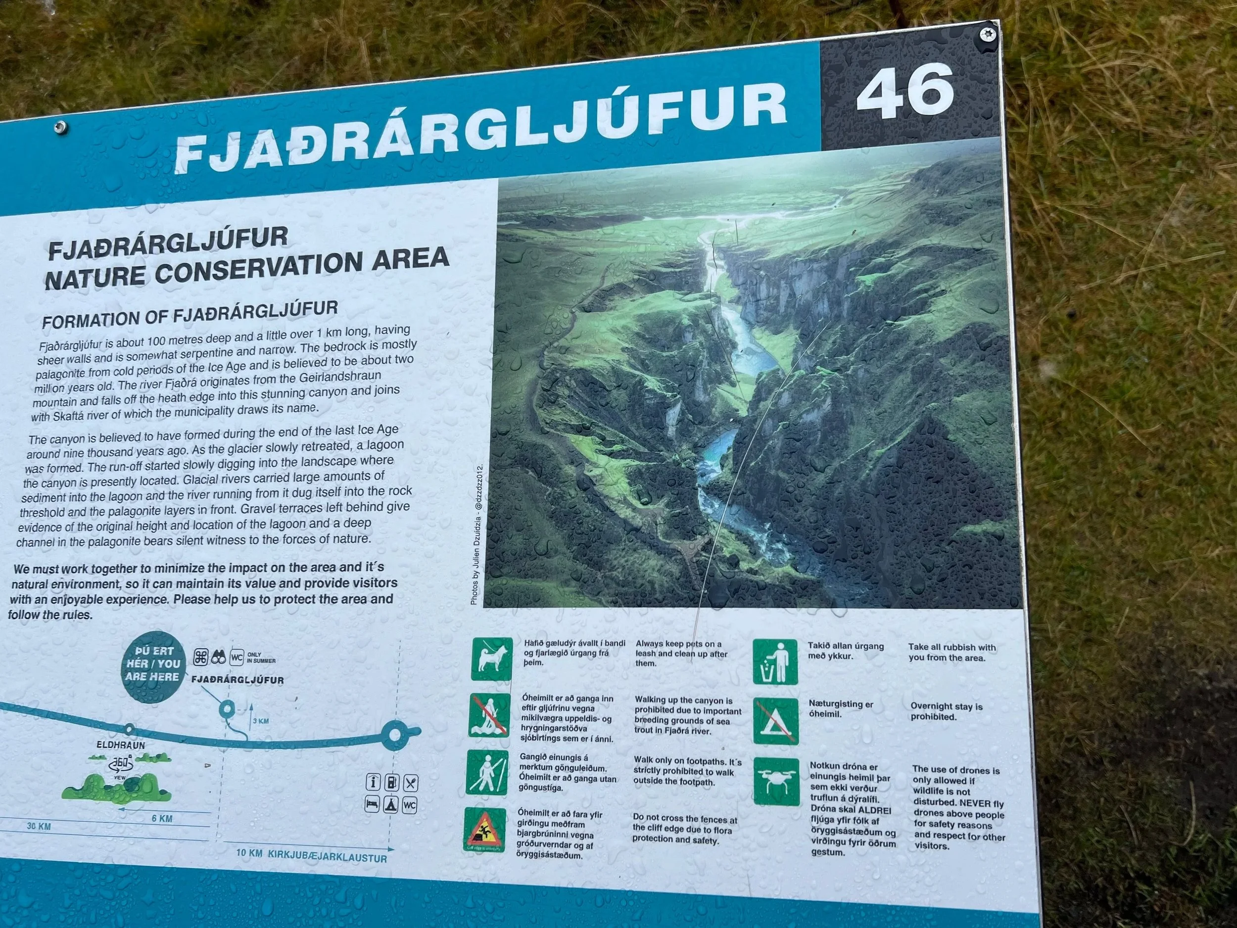 Started our drive to Vik and stopped at Fjadragljufur Canyon. It was a short drive off of Hwy1, but very treacherous with narrow roads and ones lane bridges on a hill around a corner. There was not a way to see around the corner to see if a car was coming. You just had to hope for the best. There was short hike from the parking lot to the canyon and easy hike to the top of a viewing area. It was still raining, so we kept the visit to a minimum.