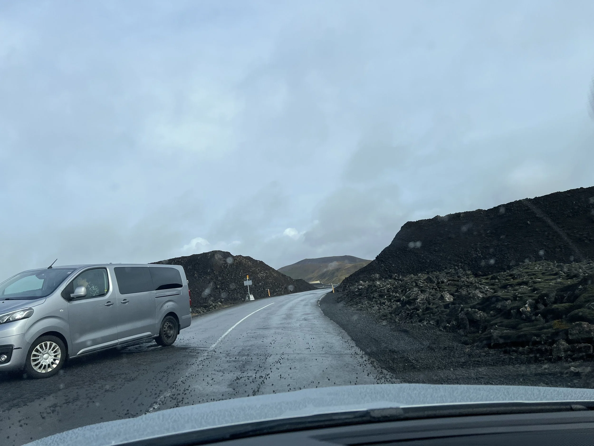 There is an active volcano near the Blue Lagoon, so the main road into the area was blocked by a large wall of volcanic sand. They had surrounded the Lagoon with this sand to protect it from any lava flows from the eruption. There was a side road we drove through where the sand was split to allow traffic in and out.