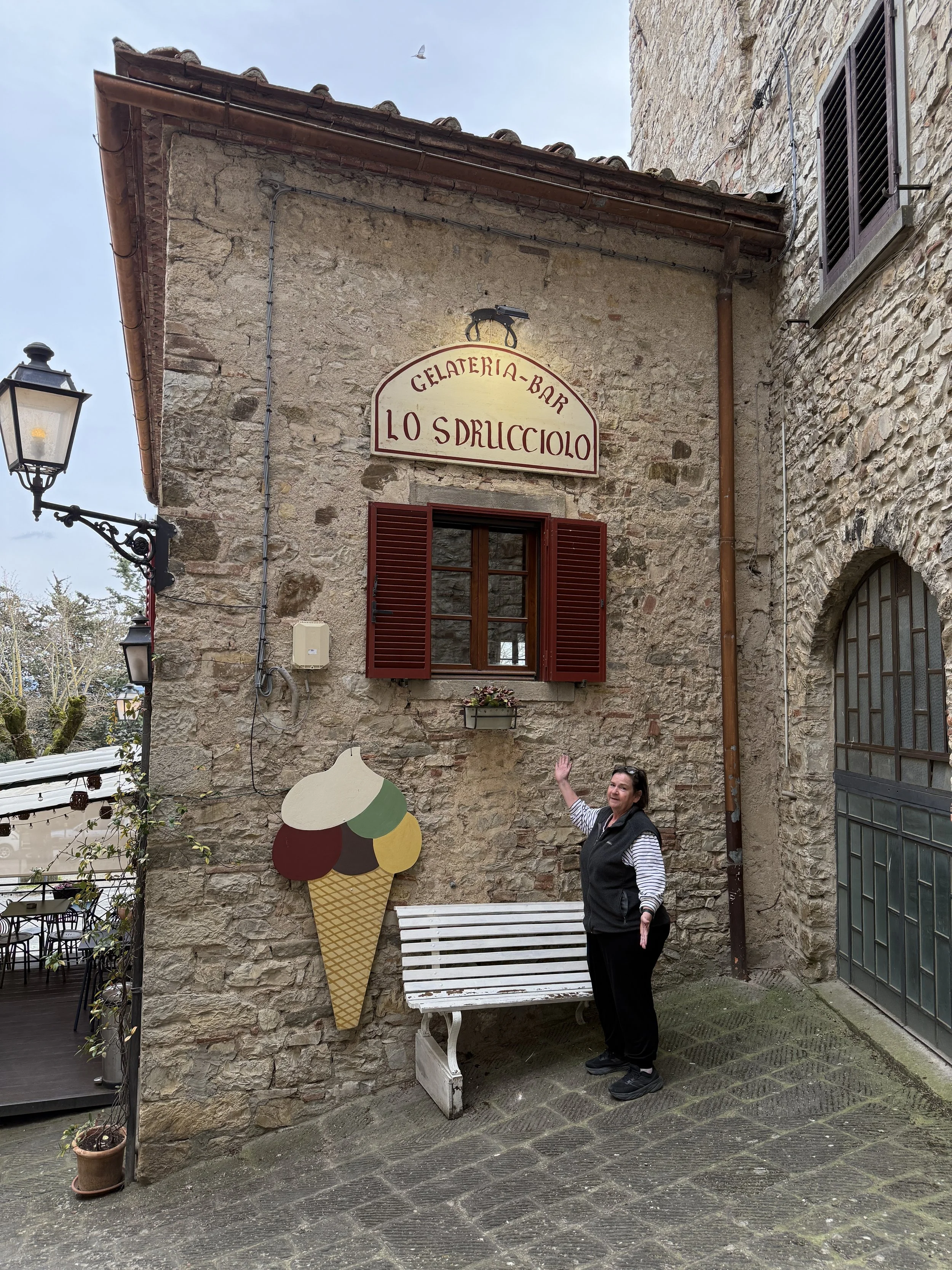 On our drive back, we meandered a bit and ran across the town of Radda. We were in search of pizza, but the restaurant was closed when we got there. We walked around the narrow streets. There were lots of bicycles and bike shops here. Apparently this is the center of the premier cycling hub for the area. There iks a well known 31 km route that starts and ends in Radda. We did not find pizza, but we did find Gelato!